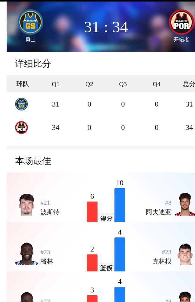 开拓者的球员也在穷追猛打,最后以34-31处于领先。